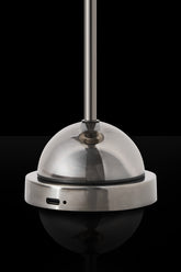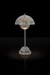 LA VERTIGINEUSE is a tactile, portable table lamp designed to enhance your space. Its slender silhouette, poised on a fine axis, captures attention. A simple touch on its top reveals one of its three light intensities: soft, suggestive or bright. With its smoked grey glass dome and silver aluminum base, LA VERTIGINEUSE embodies feminine elegance — a unique decorative object. Discreetly rechargeable, it offers up to 8 hours of autonomy. Its activation is simple and intuitive: one touch is enough to switch it on.