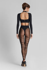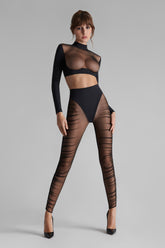 High-waisted, bi-material leggings. The high-cut opaque thong insert at the front and back, accentuated by a wide covered elasticated waistband, elongates the silhouette. Fully sheer tulle structured with side seam pleats sculpts feline-looking legs.
