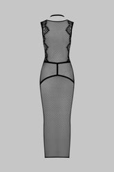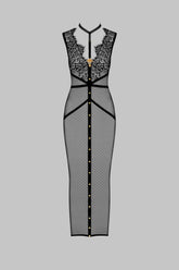 Long dress adorned with a gold cross to team Gothic lace with Swiss dot stretch mesh. Elasticated picot trim details structure the silhouette. Embellished with a removable and adjustable harness that attaches with a gold cross to different buttons. This body-con dress turns into a haunting ready-to-wear garment that can be worn day and night.