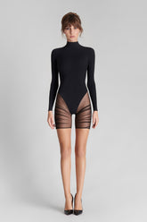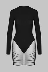 Long-sleeved bi-material teddy. The opacity of the fabric covers the upper body and has a high-cut thong body effect with a high collar. Back zip fastening embellished with a gold adornment. The buttocks and legs make a statement in fully sheer tulle, structured with pleated seams at the sides.
