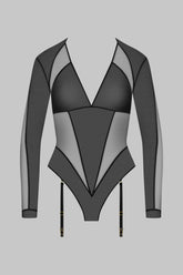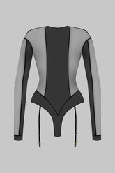 The L’AMOUREUSE long-sleeve string body, in tulle of absolute transparency, is structured by seamwork and doubled tulle that shape the silhouette and emphasize the waist. Adjustable, removable outer garters allow it to be paired with stockings. The body is openable and adjustable at the crotch with a hook closure.