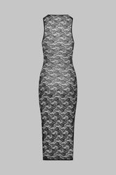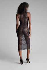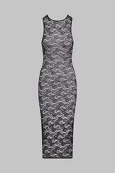 This midi dress is embellished with mostly recycled openwork lace. Fitted style with flat elasticated trim. The midi length accentuates your curves for a confident '80s style.