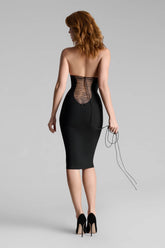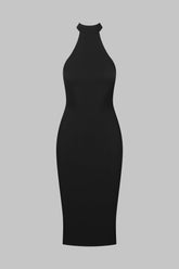 This halter midi dress offers a sleek, fitted silhouette. The open back is adorned with adjustable lacing featuring a regulator for precise adjustment. The halter neckline is equipped with a black metal hook and three adjustment settings. Its midi length makes it an ultra-elegant piece.
