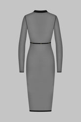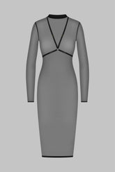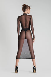 The midi dress with long sleeves in black features soft mesh with a sheer iridescent appearance.