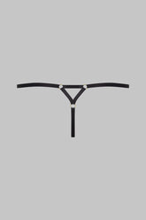 Matte leather effect mini-G-string. Golden rings connect the elasticated straps at the hollow of back. The collection's signature golden "feti-chic" ring embellishes the front, inviting you to attach it.