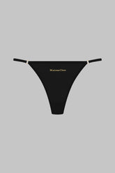 Mini string crafted from fine jersey with shiny and subtly transparent highlights. It is edged with an ultra-flat elastic invisible under clothing. Very thin elastic bands connected by a golden ring at the small of the back. The Maison Close golden logo signature is displayed at the front.