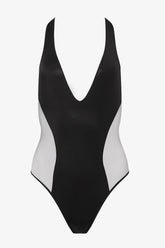 The Minuit backless one-piece swimsuit combines opaque microfiber and sheer tulle for a subtle, graphic effect, elevated by a black metallic finish that offers a discreet shine. Its plunging neckline and bare back reveal just enough, while the thong-style cut enhances the silhouette. This pull-on design, with no opening at the gusset, ensures a sleek, elegant line. Tulle panels from the sides to the back, trimmed with shimmering microfiber, provide a refined finish. Lined at the gusset, this swimsuit remains comfortable thanks to its fine, flexible elastics and a silver-tone hook fastening at the neck.