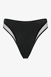 The Minuit high-waisted tanga bikini bottom combines opaque microfiber with sheer tulle, both enhanced by a silver-black metallic finish that subtly catches the light. Its high-waisted cut flatters the waist, while the thong-style back elongates the silhouette. Sheer tulle panels, trimmed with a shimmering finish, create a delicate and graphic contrast. Lined only at the gusset, this bikini bottom is made from a form-fitting, comfortable fabric with fine, flexible elastics.