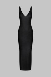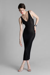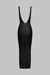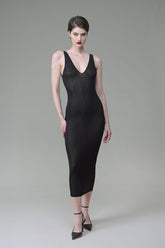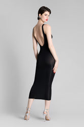 Naked back dress with a unique feel. Stretchy, ultra-soft, lightweight ribbed modal that stretches and has a sheer, shiny sheen. Streamlined, snug fit with plunging V necklines at the front and back, supported by wide straps.