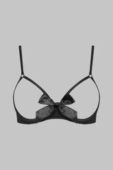 Peephole microfibre basque bra with elasticated picot trim. Cupless design with two pieces of elastic; this underwired style daringly reveals the bust. Clip the removable satin bow wherever you please like a little present. Elasticated straps can be adjusted with tone-on-tone accessories. Adjustable hook-and-eye fastening on the back.