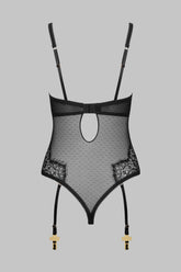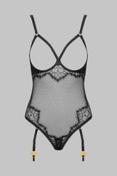 Peephole thong bodysuit adorned with a gold cross to team Gothic lace with Swiss dot stretch mesh. Supported by underwiring and spaghetti straps with elasticated picot trim to audaciously reveal the breasts. Opens with hook-and-eye fastener at the crotch and back. Trimmed with 4 suspender straps with adjustable, detachable extenders with gold crosses.