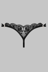 Naked thong made of fine guipure that delicately moulds to the dip above the buttocks. Like jewellery against your skin, for a nearly nude look. Delicate satin ribbons that adjust with gold accessories.