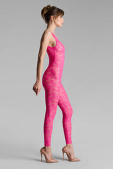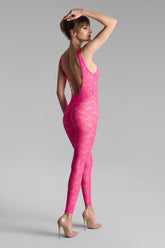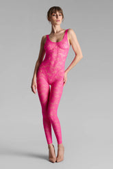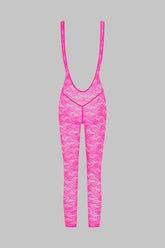 The neon-coloured open-back Catsuit is adorned with mostly recycled openwork lace. Slim fit edged with a flat elastic. Its cleavage, its low-cut armhole and its vertiginous bare back take us back to the 80s.