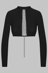 The backless top from the Nuit Infinie collection combines simplicity with intricate details. Its high neckline, adjustable with a black metal hook, elegantly frames the neck while revealing a delicate rounded opening at the back. The lacing at the neckline subtly highlights the chest. The fitted cut and long sleeves create a refined silhouette, making it perfect for both day and evening wear.