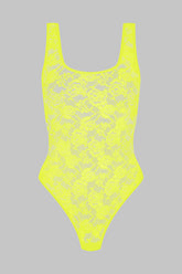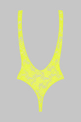 The neon-colored thong bodysuit is adorned with mostly recycled openwork lace. Wide straps reveal a low-cut back edged with a flat elastic. Slim fit edged with a flat elastic. Its cleavage, its low-cut armhole and its vertiginous bare back take us back to the 80s.