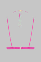 Open triangle bra, combining satin softness and boldness. Designed to reveal breasts in style. The neck lacing, repositionable and adjustable thanks to a unique adjuster and golden lipstick accessories by Maison Close, sublimates your cleavage while allowing customization according to your desires. The thin, flat, adjustable straps ensure a perfect fit. An elastic band around the bust structures the chest. Adjustable hook closure at the back.