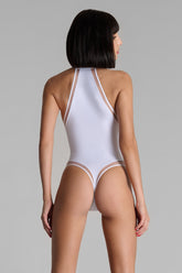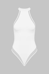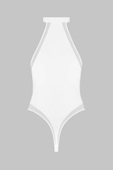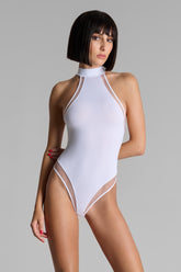 The halter-neck thong bodysuit – Pure Tentation is a piece of sharp lines and bold style. Its two-material design contrasts sheer tulle with the soft opacity of microfiber, revealing or concealing. The pull-on high neck elongates the silhouette elegantly, while the thong back subtly reveals the lower body. A crotch hook-and-eye closure allows easy dressing, and a cotton lining ensures comfort.