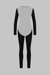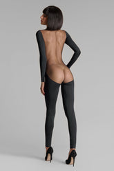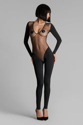The long-sleeve sheer-back catsuit Pure Tentation is a statement piece. Crafted from ultra-sheer tulle and opaque microfiber, it plays with contrasts to create a fluid, bold, and almost elusive silhouette.