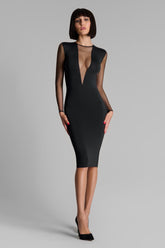 The deep V-neck subtly elongates the torso, while the ultra-sheer back creates a second-skin effect in contrast with the opaque front. The midi length gently grazes the legs for a refined, dressed yet intensely sensual look.
