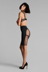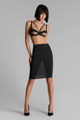 The skirt – Pure Tentation blurs the lines between lingerie and outerwear. In sheer tulle and opaque microfiber, it lays over the skin like a graphic veil, subtly reshaping the curves. Halfway between garment and performance, this skirt challenges conventions. Sheer at the back, it plays with what it reveals and conceals. An elastic waistband ensures a secure fit, while an adjustable, removable back strap adds an unexpected touch—ready to suit the moment or the mood.