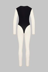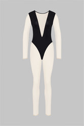 The V-neck long-sleeve catsuit – Pure Tentation wraps the body in a soft glow. Made from sheer tulle and opaque microfiber, it creates a graphic and sensual thong-body illusion effect.