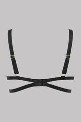 Opaque microfibre bondage bra. Harnessed with elasticated straps along the cleavage and on the back. Microfibre covered underwired push-up cups. Adjustable hook-and-eye fastening on the cutaway back.