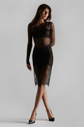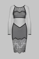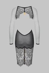 Long-sleeved open back dress combining rigid eyelash lace and stretch Swiss dot mesh. Elasticated picot trim details structure the silhouette.A lace yoke reveals a bare back adorned with an Inspiration Divine engraved golden cross. An openable buttonhole with golden finishes enhances the curves. A Swiss dot mesh lining covers the buttocks and bust.