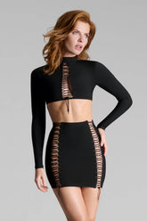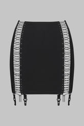 The mini skirt features removable garter straps for a versatile style. Its reversible design allows the lacing to be worn at the front or the back, depending on your preference. The high-waisted fitted cut is designed to elongate the silhouette, while the rigid cords, adjustable with stoppers, ensure a precise and lasting fit.