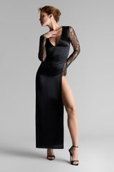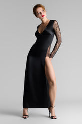 Long dress with slit in silk and eyelash lace. Long flowing ultra-feminine silk garment with slit. V neckline and an all-silk back delicately hugs the figure. A sublime high-cut slit adorned with rigid lace elegantly shows off the leg. Sheer lace long sleeves. Opens with an invisible side zip.