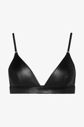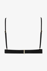The Splash Triangle Bikini Top seduces with its ultra-light microfiber and wet-look finish, clinging to the body like a second skin. Its unlined, figure-hugging fabric and darted triangle shape create a natural yet structured silhouette. Wire-free, it remains light and endlessly comfortable. Non-removable straps, adjustable with delicate gold-tone metal accents, ensure a flawless fit. A gold-tone hook closure at the back completes this refined design.