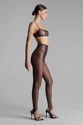 The L’AMOUREUSE stirrup leggings, in tulle of absolute transparency, are structured by seamwork that shapes the full silhouette, with a double couture-stocking effect and a stirrup finish. High waist doubled at the front and back. Removable, adjustable neck harness, two-way crotch zip.