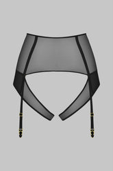 The L’AMOUREUSE open high-waist briefs, in tulle of absolute transparency, feature a waistband structured with soft corset-style boning. Two overlapping front panels, openable at the crotch, reveal the curves. Adjustable, removable garters allow the piece to be paired with stockings.