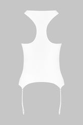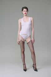 Tank top with suspenders with a unique feel. Stretchy, ultra-soft, lightweight ribbed modal that stretches and has a sheer, shiny sheen. Figure-hugging, streamlined design with a scoop neckline and racer back. Embellished with four non-removable adjustable, modal-covered elastic suspenders with silver trim.