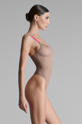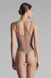 This nude colour thong body features soft mesh with a sheer iridescent appearance.