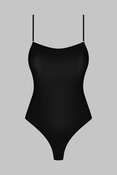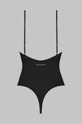 String body crafted from fine jersey with shiny and subtly transparent highlights. Ultra high-cut at the back and hips with its 90s design. Edged with ultra-flat elastic invisible under clothing. The Maison Close golden logo signature is displayed at the back. Two wide, fine straps, adjustable and non-removable with golden hardware.