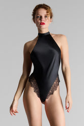 Thong body with American neckline in silk and eyelash lace. Scoop cut adorned with rigid lace that subtly shows-off the hips and buttocks. An American neckline delicately reveals the bust. Neck closure with silk ribbon to tie as you desire. Non-openable crotch for extra comfort.