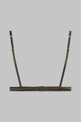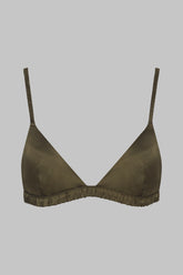 Natural silk triangle bra. Triangle cups without underwire that hold the breasts perfectly. Thin straps covered with gathered silk at the front and adjustable elastics at the back with golden accessories. Elastic band covered with gathered silk beneath the breasts. Fastens at the back with a adjustable clip.