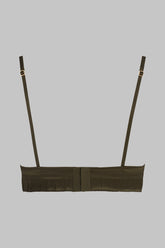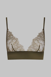 Strapless triangle bra in silk and eyelash lace. Triangle cups without underwire in transparent rigid lace that perfectly hold the breasts. A wide elastic band at the back covered in gathered silk provides perfect support. Fastens at the back with a adjustable clip. Delicate adjustable straps with golden accessories.