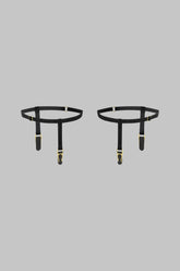 The VELVET SET black garters enhance the legs with refined elegance. Crafted from soft-touch velvet, they are fully adjustable to suit all body types. Featuring golden suspenders, they can be gracefully paired with stockings. Wear them alone or styled with the matching panty and harness from the collection. An accessory that bridges the body and the detail.