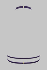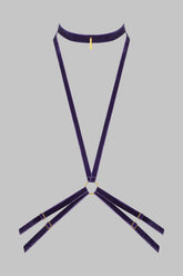 The VELVET SET purple harness traces the lines of the bust with precision. Made from soft-touch velvet, it features adjustable straps that gently embrace the silhouette. A golden Maison Close-engraved charm adorns the piece. Designed to be worn on its own or attached to the matching open panty, it creates the illusion of a bodysuit. A versatile lingerie accessory, delivered in its black velvet pouch.