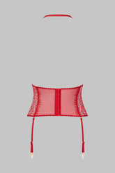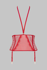 Waist-cincher suspender belt combining eyelash lace with see-through tulle edged with picot elastic. Graphic cut that accentuates the waist. Suspenders and choker harness are removable and can be adjusted with gold-tone accessories. Flexible vertical whalebones for improved structure and support. Adjustable hook-and-eye fastening on the back. Can be worn as a suspender belt or a waist-cincher.