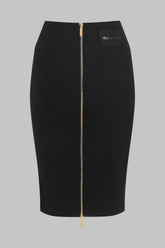 The Pencil Skirt is characterised by its body-hugging, structured cut that creates a strong silhouette. Crafted from lined wool broadcloth, it features a double front opening with two gold metal zips for a custom fit and a two-way zip fastening at the back, elegantly highlighting your curves.