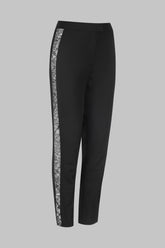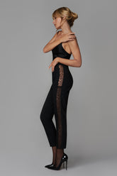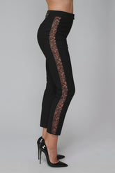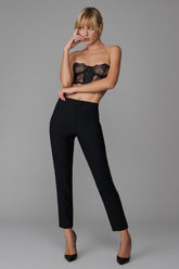 The slim-fitting cigarette-cut trousers are made from unlined wool broadcloth. They feature strips of French Leavers lace adorned with satin piping that flatters the legs, from ankles to hips.