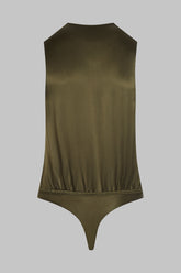 Wrap over thong bodysuit in natural silk with a deep V neckline. Sublime pleats at the shoulders and a perfect thong cut make it an essential garment. A thin elastic waistband covered in gathered silk elegantly outlines the waist. Non-openable crotch for extra comfort.